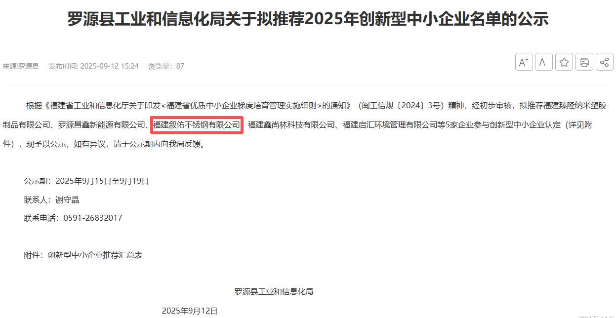 2025年9月12日,羅源縣工業和信息化局就擬推薦2025年創新型中小企業名單對外進行公示。