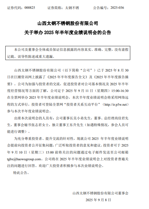 2025年9月8日,據(jù)《山西太鋼不銹鋼股份有限公司關(guān)于舉辦2025年半年度業(yè)績(jī)說(shuō)明會(huì)的公告》顯示,公司定于2025年9月11日(星期四)15:00-16:30在全景網(wǎng)舉辦 2025年半年度業(yè)績(jī)說(shuō)明會(huì)。