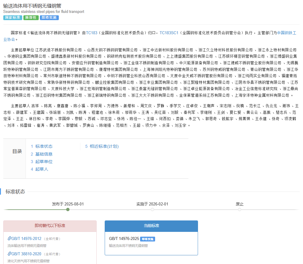 2025年8月1日,由江蘇武進不銹股份有限公司 、山西太鋼不銹鋼鋼管有限公司 、浙江中達新材料股份有限公司 、浙江久立特材科技股份有限公司等主要單位起草的國家標準《輸送流體用不銹鋼無縫鋼管》發布,將于2026年2月1日實施。