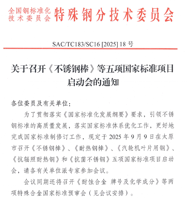 2025年9月9日,《不銹鋼棒》、《耐熱鋼棒》、《汽輪機(jī)葉片用鋼》、《抗輻照耐熱鋼》和《抗菌不銹鋼》五項國家標(biāo)準(zhǔn)項目啟動會將于太原市召開。